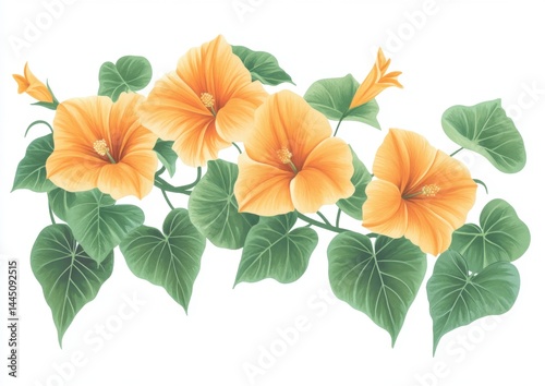flower, vine, orange, leaf, plant, floral, illustration, design, nature, botanical, tropical, decorative, pattern, background, decoration, art, spring, summer, garden, beauty, bloom, hanging, tree branch, green, yellow, high-coloured, vibrant, border, ornamental, wall, fabric, textile, wallpaper, print, poster, digital, beautiful, exotic, foliage, artwork, ornament