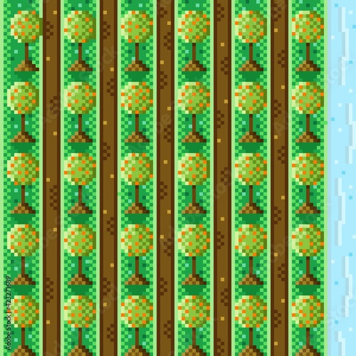 Orange garden pixel art. Orange tree pixel art. Vector picture.