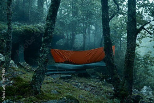 Orange Hammock Suspended Between Trees in a Misty Forest
