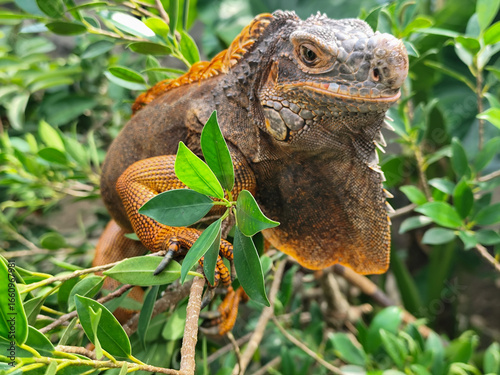Orange iguana is sunbathing on a green leafy tree trunk, in the morning, with a natural blurred background.