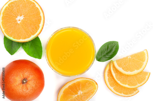 orange juice glass with slices of citrus and leaves isolated on white background with copy space for your text, top view