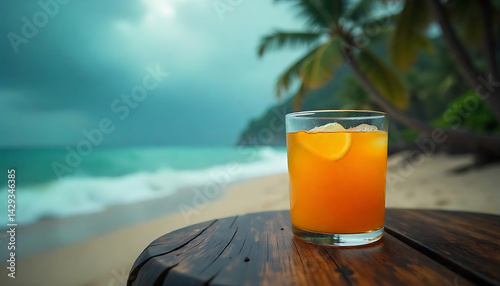 Orange juice on the beach table. Sunny, tropical vibe, Summer refreshment vibes, created with generative ai