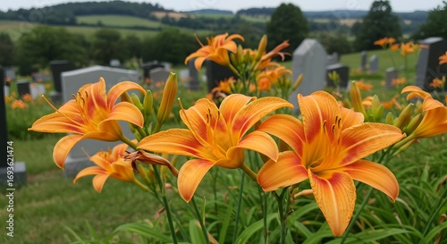 lily, orange flower, flower, cemetery, gravestone, garden, nature, floral, blossom, plant, high-coloured, bright, closeup, detail, background, hill, green, summer, floral pattern, remembrance, memorial, peace, calmness, symbolism, decoration, beauty, flora, vivid colors, nature scene, landscape, copy space, floral arrangement, still life, orange, red, yellow