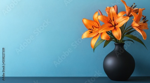 Orange lilies in a black vase against a light teal wall.