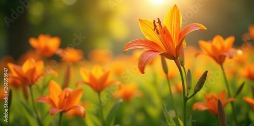 Orange lily flowers dance in the warm sunlight of a summer garden, blooming, flower fields, wildflowers