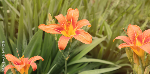 Orange lily flowers on a green background. Summer concept. Selective focus. Banner.