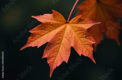 Orange Maple Leaf close-up with drops after rain on dark background