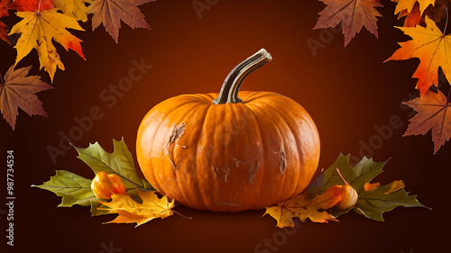 Orange pumpkin and fall leaves on brown background, autumn harvest and Thanksgiving celebration.