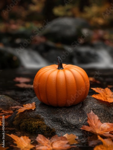 Orange pumpkin on a rock surrounded by autumn leaves near a gentle stream.