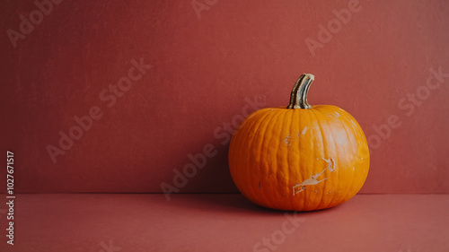 Orange pumpkin on red background, autumn harvest, minimalist design, Thanksgiving celebration.