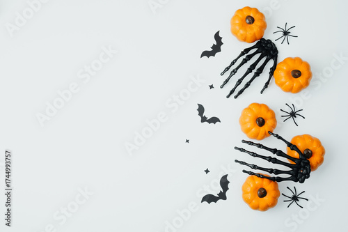 Orange pumpkins and black skeleton hands with bats and spiders against white backdrop.
