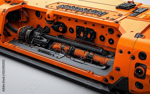 Orange robotic mechanism cutaway revealing internal components and gears.