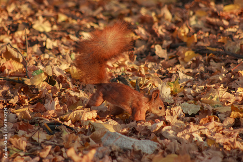 Orange shaggy squirrel in the ground in autumn leaves