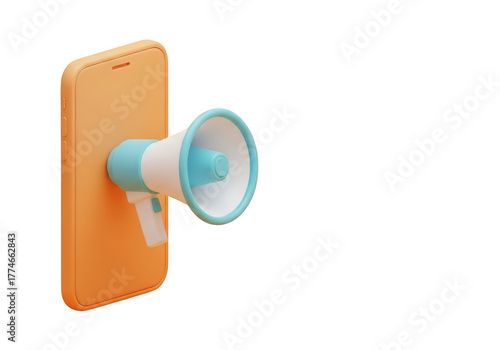 Orange smartphone with teal and white megaphone attached isolated on transparent background