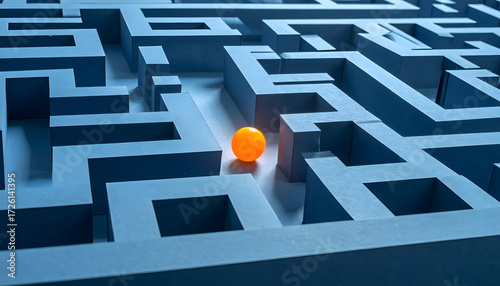 Orange sphere navigating through a dark blue maze, representing leadership, focus, and overcoming challenges.