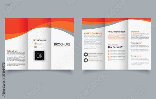 Orange trifold brochure with shapes, waves. Ready Brochure. Editable image.