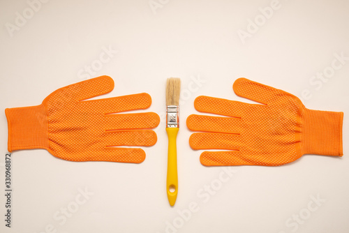glove, safety, brush, equipment, carpenter, handyman, tool, mask, labor, fabric, safe, clothing, protective, repair, wear, protection, industry, manual, construction, hand, pair, orange, industrial, material, supply, professional, domestic, object, rubber, white, men at work, isolated, work, leather, closeup, clothes, renovation, gardening, background, concept, protect, garden, used, construct, freshness, latex, supply, hygiene, maid, housework