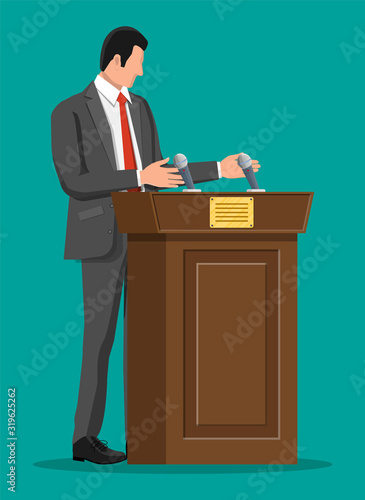 Orator speaking from tribune. Public speaker. Wooden rostrum with microphones for presentation. Stand, podium for conferences, lectures debates. Political and ballot. Flat vector illustration