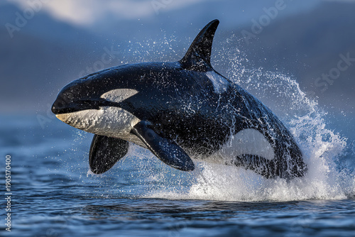Orca whale breaching ocean water splash powerful leap marine mammal black white aquatic wildlife nature action