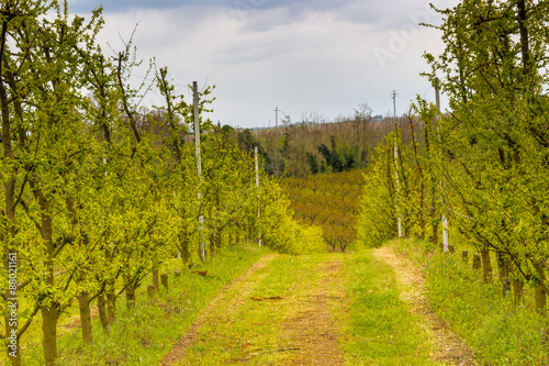 orchards organized into rows on rolling hills