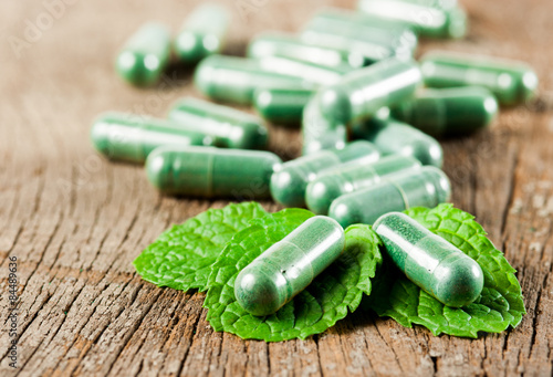 mint, wood, organic, capsule, medicine, leaf, herbal, green, healthy, natural, plant, health, herb, alternative, white, background, nature, medicals, health care, vitamin, pharmacy, drug, pill, medication, fresh