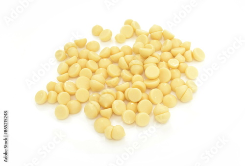 Organic cocoa butter buttons (wafers) isolated on white background