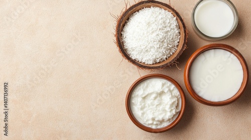Organic Coconut Products: Oil, Milk, and Flesh in Natural Presentation