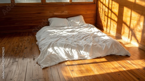 Organic cotton bedding bathed in natural sunlight creating a cozy and serene atmosphere in a rustic bedroom setting The warm glow and inviting textures evoke a sense of comfort and relaxation