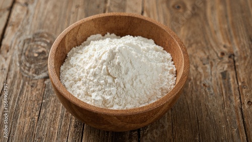 Organic flour displayed in rustic wooden bowl