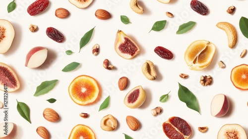 organic, food, repeat, pattern, stylised, dried, fruit, design, scattered, nut, illustration, fresh, segment, leafy, green, accent, earth, tone, colours, palette, minimalist, icon, continuous, surface, contemporary, vector, art, clean, graphic, style