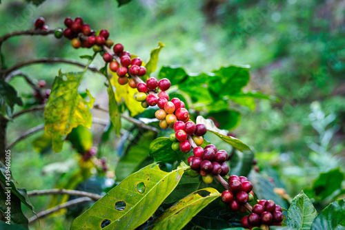 organic red raw coffee beans on the brances of the coffee tree in the plantation north of chiang mai thailand.