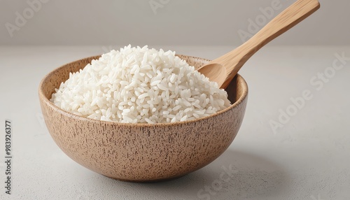 Organic rice, in a bowl with wooden spoon, 3D illustration