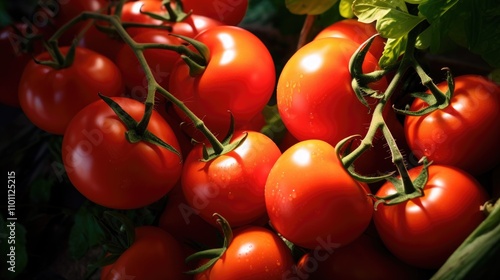 Organic ripe red tomatoes clustered together showcasing freshness and vibrant colors against green foliage in a natural setting.