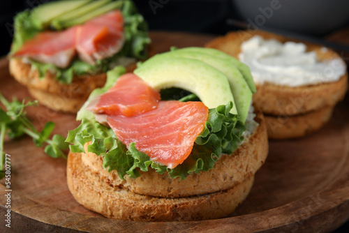 organic rusks with salmon, cream cheese and avocado served on wooden board, closeup