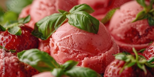 strawberry, gelato, organic, basil, fresh, scoop, dessert, texture, creamy, glacé, food, sweet, italian, summer, favor, herb, indulgent, treat, dairy, artisanal, epicure, vibrant, colourful, refreshing, natural, delicious, fruit, green, cookery, hand-made