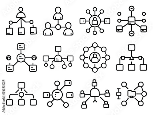 Organizational Chart and Network Hierarchy Icon Set – Team Structure, Workflow Diagram, Business Management, Data Mapping and Connection Line Icons for Digital and Corporate Use