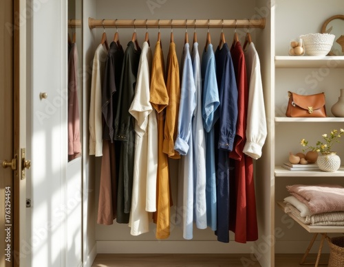 closet, clothes rack, clothing, organised, hanging, apparel, garment, home, interior, storage, organisation, neat, tidy, minimalist, modern, rack, shelf, shelf, wooden, wood, domestic, lifestyle, fashion, design, arrangement, nobody, indoor, inside, personal, style, clean