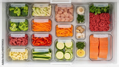 organised, refrigerator, drawer, fresh, vegetable, chicken, minced, meat, salmon, container, broccoli, carrot, bell, pepper, courgette, garlic, herb, lemon, ginger, storage, neat, order, healthy, meal, preparation, ingredient, diet, culinary, kitchen, tidy, transparent, chopped, slice, plastic, food, layout, box, colourful, freshness, nourishment, design, home, interior, lifestyle, cooking