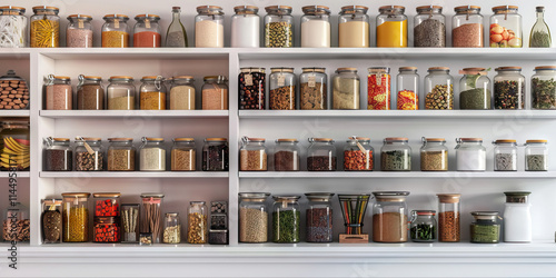 Organized Pantry Shelf with Glass Jars of Dried Foods and Spices