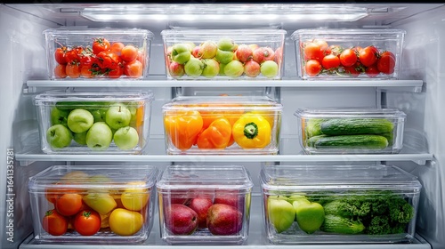 Organized Refrigerator Interior Featuring Fresh Fruits and Vegetables Stored in Clear Plastic Containers for Healthy Eating