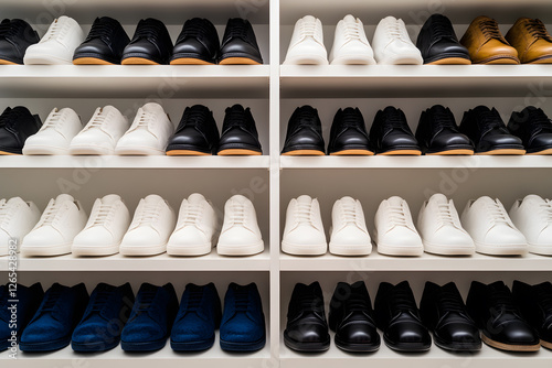 shoe, shoe, footwear, white, black, brown, blue, closet, shelf, organised, neat, arrangement, collection, style, fashion, minimalist, interior, indoor, white background, clean, row, leather, formal, male, clothes rack, storage, display, minimalism, simple, design, contemporary, modern, elegance, stylish, casual attire, neutral, classic