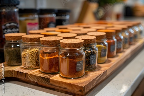 Organized Spice Collection in Glass Jars on a Wooden Tray