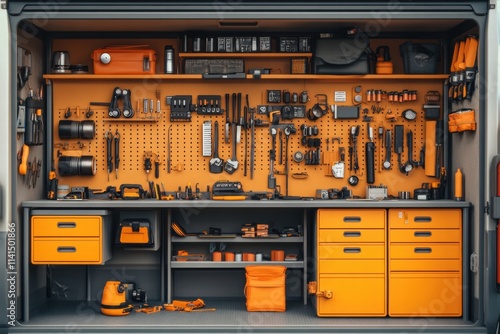 Organized Tool Wall with Bright Orange Equipment and Storage Solutions