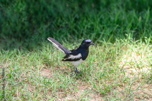 Oriental magpie robin, Tiny bird standing on grass in countryside