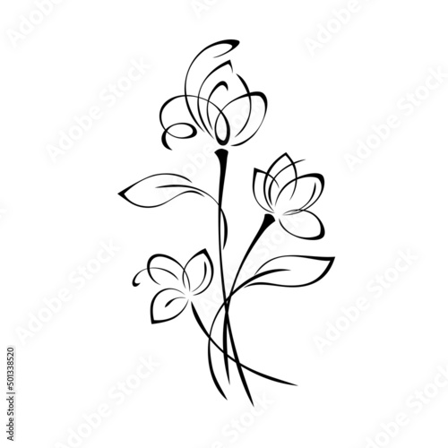 ornament 2291. bouquet of three stylized flowers on stems with leaves in black lines on a white background