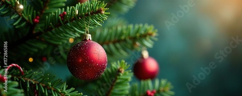 Ornament hangs from a sturdy green branch on the fir Christmas tree, holly, sparkling, branch