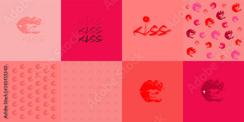 Ornament with inscriptions and kisses in red tones. Vector graphics.