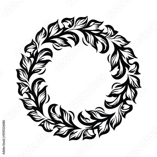 Ornamental Black and White Floral Wreath Design, Decorative Leaves, Abstract Circle Art