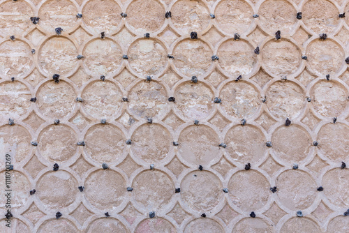 Ornamental stone facade of the Alcazar of Segovia, Spain. Islamic ornaments with circular sgraffito motifs, carved circles on stone wall.