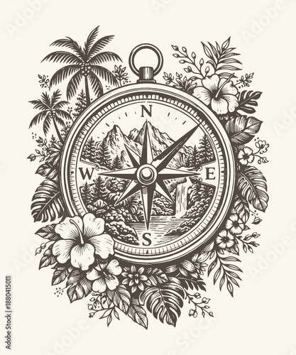 Ornamental vintage compass with floral decoration, detailed hand drawn engraving style navigation vector illustration
